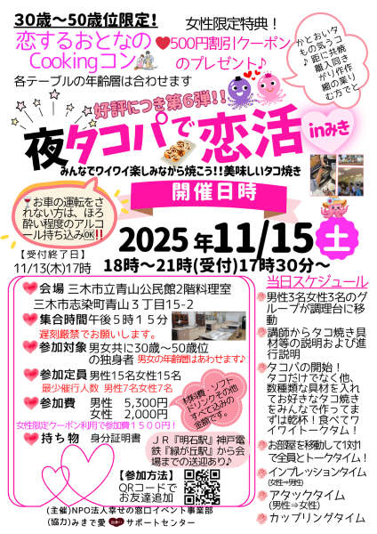 みきで愛協力イベント☆30歳~50歳位の独身限定!夜タコパで恋活♡INみき